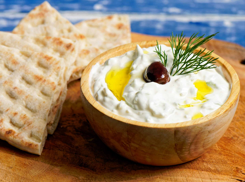 2. Pelez et hachez l’ail. Mettez-le dans un saladier, ajoutez les yaourts, arrosez d’huile d’olive et de vinaigre, salez et mélangez vivement.